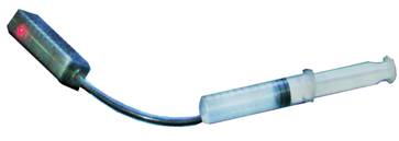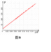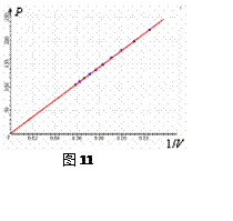 DIS实验过程、现象而产生的联想是学生形成创新的源泉,例如学生在研究气体在等温过程中压强(P)与体积(V)的关系实验中,测定了一系列压强与体积的数据,并作出的图线。但所有同学作出的直线并不是他们预料的通过原点的直线(如图9)。同学们提出了各种假设,有说是误差,有说气体在等温状态下就应该遵循这样的规律……。笔者在教学过程中,根据学生提出的各种假设,在课堂上通过合作研究、讨论等形式,然后让学生代表提出相应的解释,让其他同学进行质疑,种种假设在不断质疑过程中被否定,最终学生一致认为是由于误差而造成,并提出如下理论分析与解释:因图线在P轴上截距的意义是气体体积无穷大时的压强,而气体体积无穷大相当于近似真空,不可能有压强,因此应该是误差。原来造成误差的原因是注射器与压强传感器连接管的体积没有考虑(如图10)。为了证实他们的猜想,让直线能通过坐标原点,将体积加上不同的数据进行修正,当每个体积均加1ml时,直线通过了原点(如图11)。由此启发,同学们提出,可以用这种原理测定不规则外形微小固体的体积。方法是:取待测物体放在容器中(如注射器中),测定恒温下气体的图线,将测定的体积均加上一个数,直到压强与体积倒数的直线通过坐标原点为止,则加上的那个数为待测固体的体积。