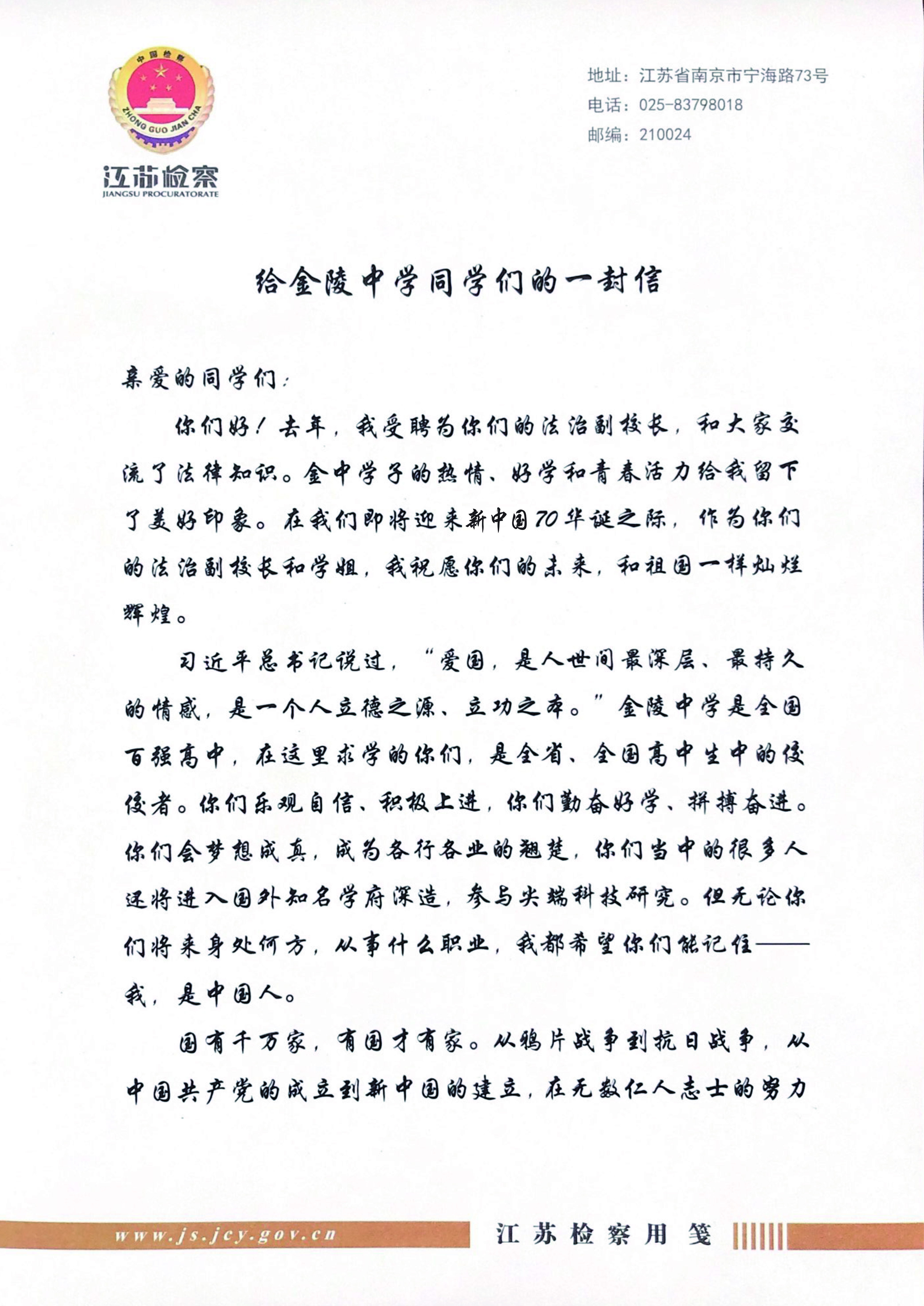 巍巍钟楼,百年金陵。爱国主义,一直是金中精神最重要的部分。在庆祝中华人民共和国成立70周年之际,江苏省人民检察院检察长、金陵中学法治副校长、金陵中学1979届校友刘华同志给全体金中学子写了一封信。